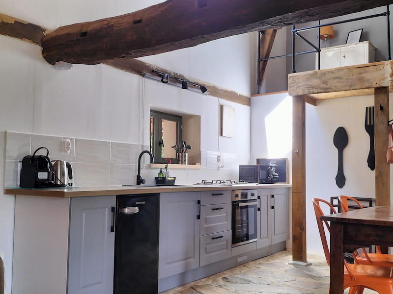 Le gîte Orange se compose du salon au rez-de-chaussée et de l’espace nuit et bain sur la mezzanine. Vous avez accès à une cuisine moderne entièrement équipée : cafetière expresso, réfrigérateur avec congélateur et un micro-ondes. Le gîte dispose d’un grand espace de vie avec deux fauteuils confortables. Vous trouverez aussi une grande table avec 4 chaises.